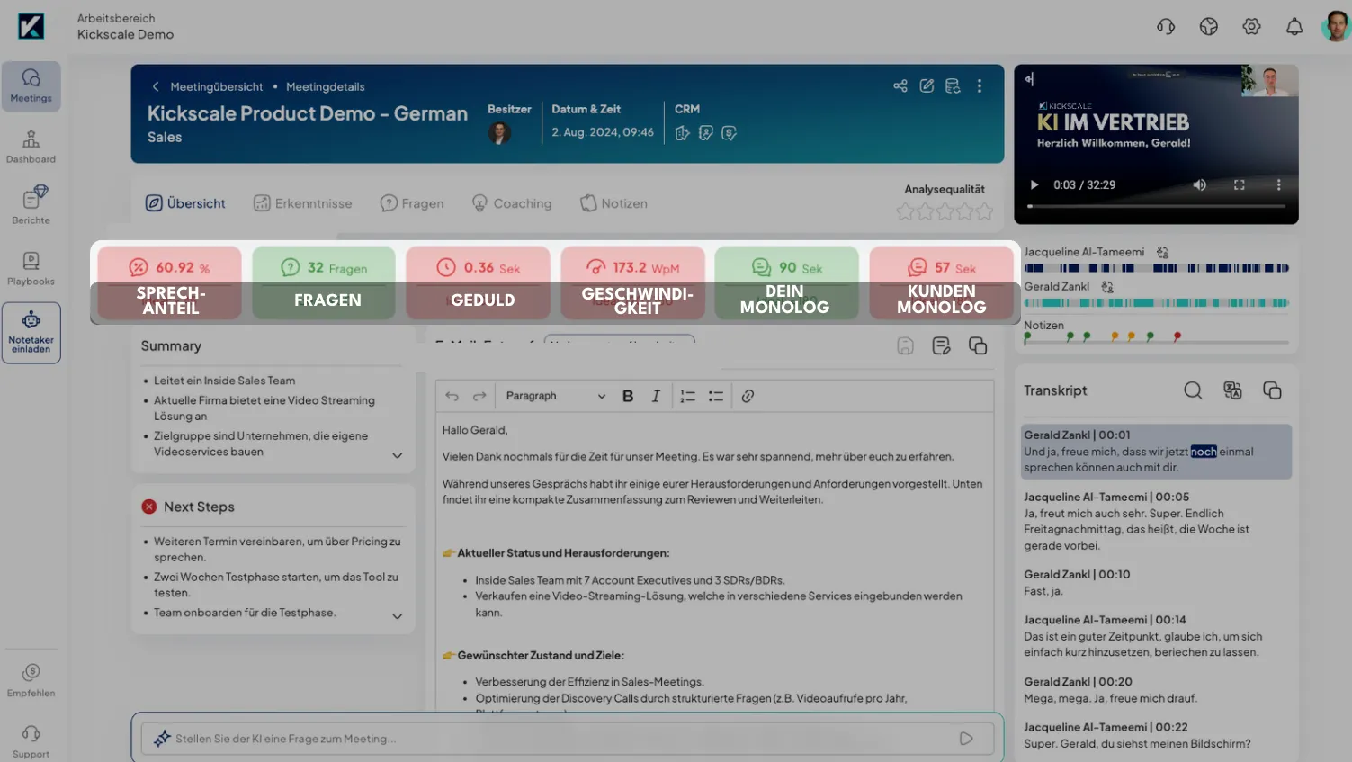 Wenn Sie messen möchten, wie Sie in Verkaufsgesprächen abschneiden, laden Sie Ihre Verkaufsgespräche kostenlos auf app.kickscale.com hoch.